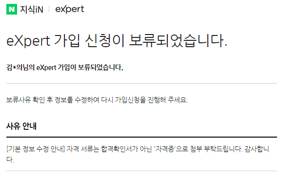 자격증이 아닌 확인서로 제출해 한 2번보류끝에 엑스퍼트 가입신청이 완료되었습니다!!